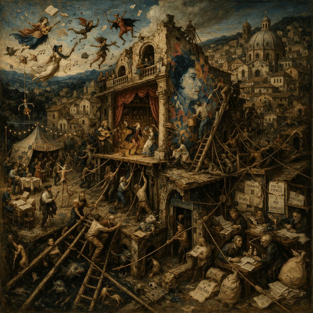 Porque una feria del libro, una obra en la calle, un concierto en una plaza o una instalación visual tienen una materialidad muy concreta. Requieren permisos, rutas de producción, uso del espacio, seguridad, aforo, coordinación pública y, muchas veces, mezclas de financiamiento y apoyo que no dependen de una sola oficina ni de un solo relato político. En Quito, incluso para un espectáculo público, la cadena ya pasa por RUC, patente, aforo, bomberos, autorizaciones y controles. O sea, la épica del artista por sí sola no alcanza. Nunca alcanzó.